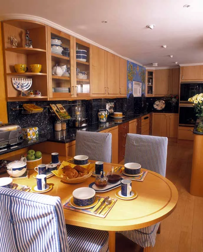 the cabinets and carcases are made in Maple veneer and solid wood. The table extended from the wall on a single leg with a concealed wheel, the extra leaf hangs on the wall as a decorative item.